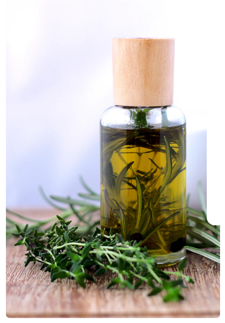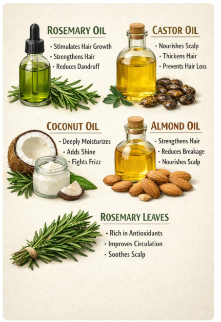 Rosemary Essential Oil – Stimulates hair growth and strengthens roots.